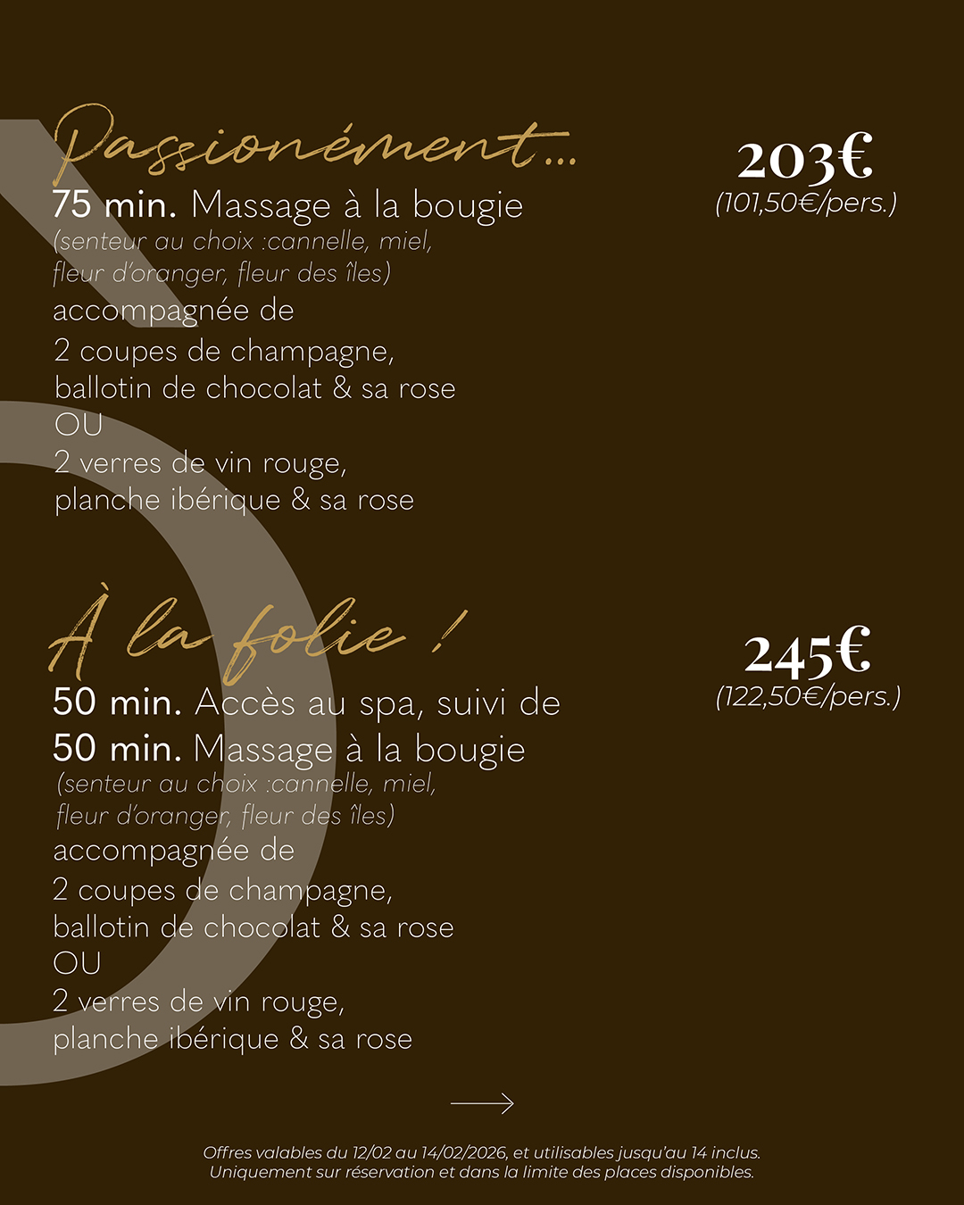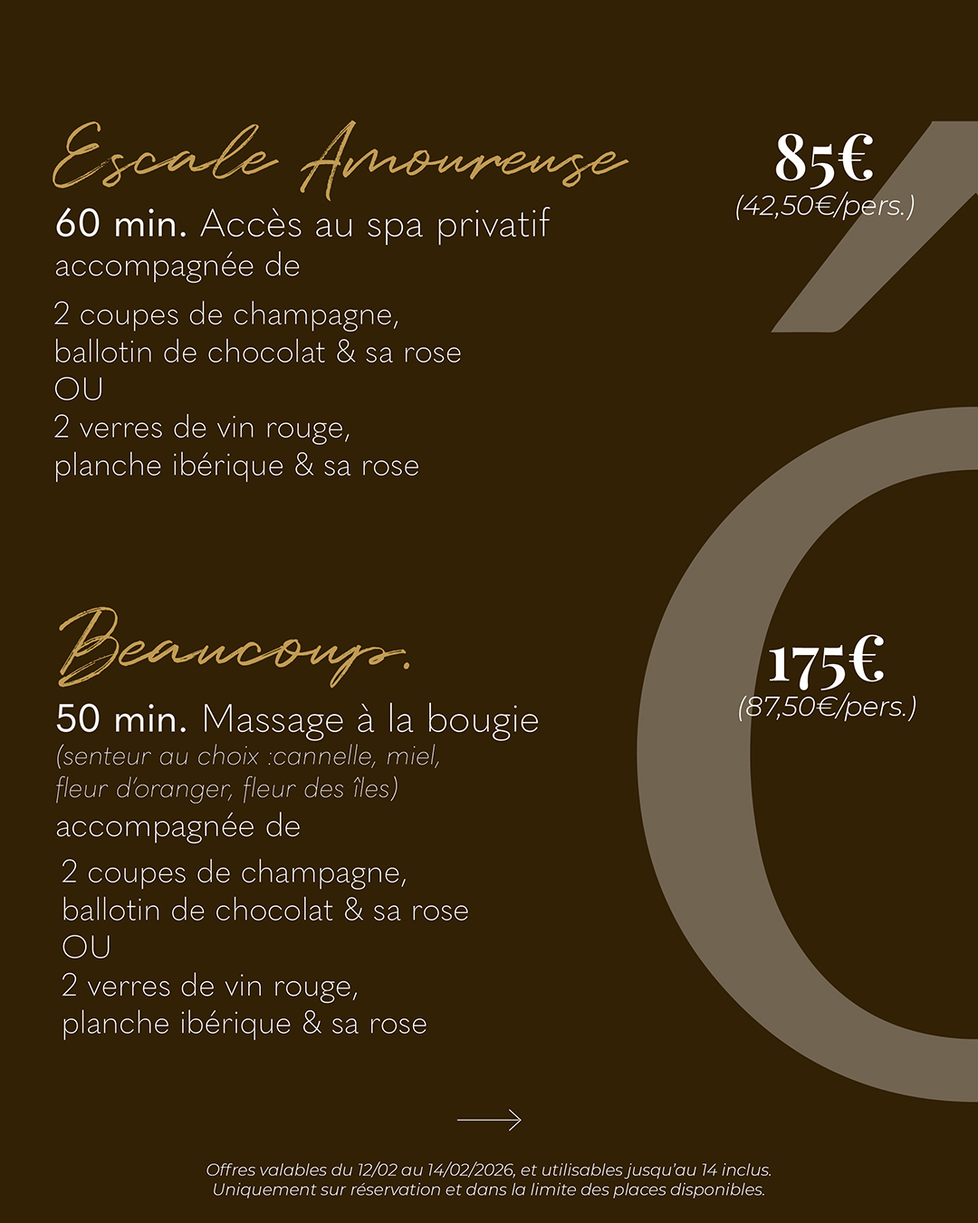 Pour vous permettre de profiter pleinement de nos offres, le vendredi 13 février, le spa sera ouvert exceptionnellement jusqu’à 21h !
